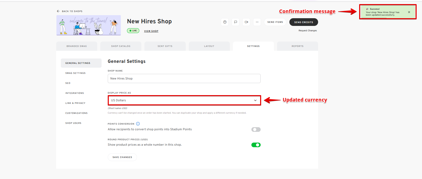 - Once saved, you will receive a confirmation message, and the information displayed for your shop will update to reflect the new currency.