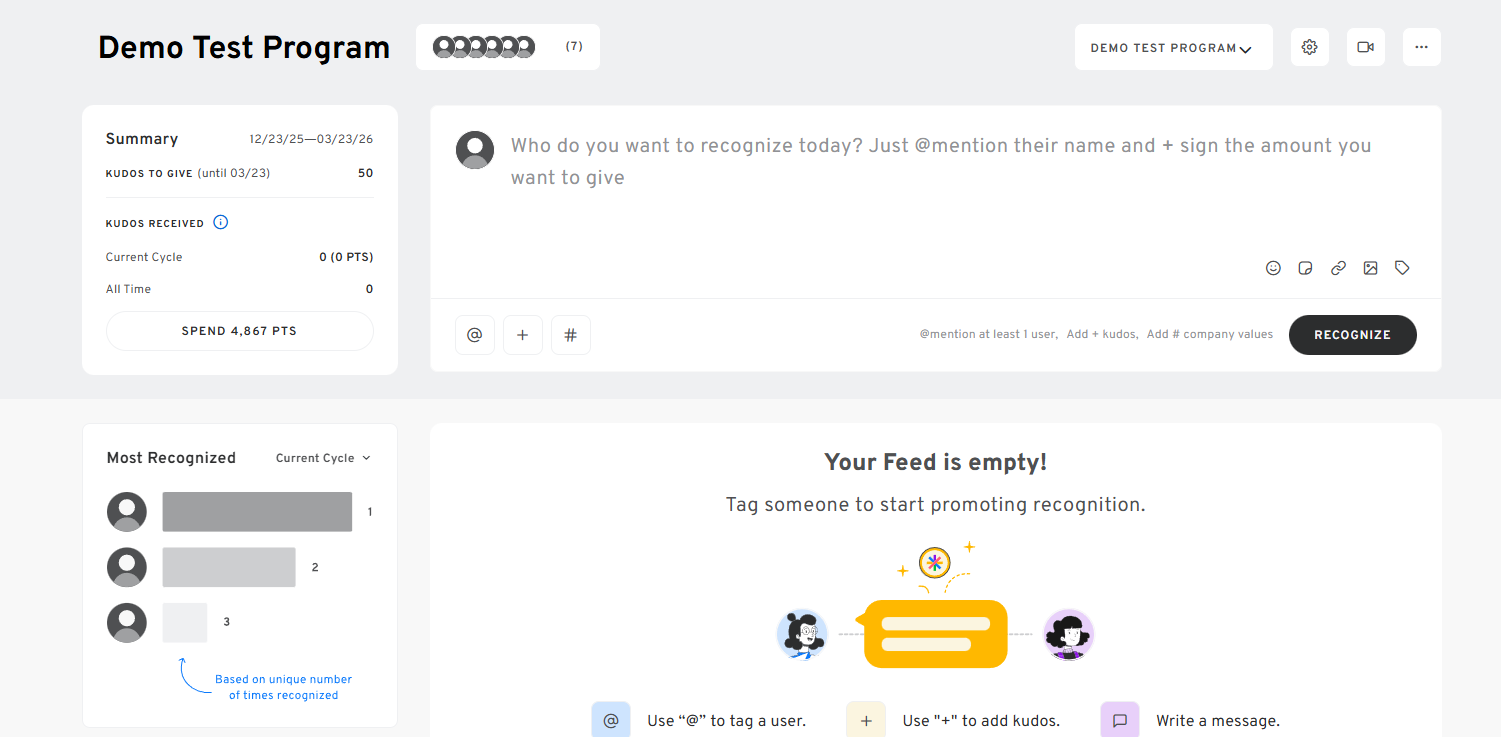 *It's important to note that the remaining kudos do not carry over from one cycle to the next. If you have not distributed all the kudos allotted for the current cycle, any remaining kudos will expire when the cycle ends. At the start of a new cycle, you will receive the full amount of kudos specified by the program owner. For example, if you are given 200 kudos per monthly cycle, and you have 50 kudos left over when the cycle ends, your total kudos will reset to 200 at the beginning of the next monthly cycle.