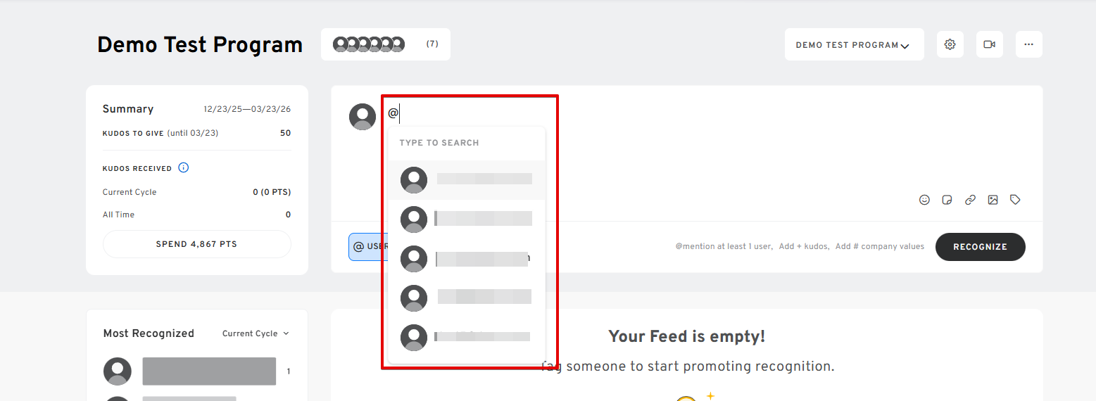 - Note that your remaining balance of kudos for the current cycle will be displayed, indicating how many more you can send.