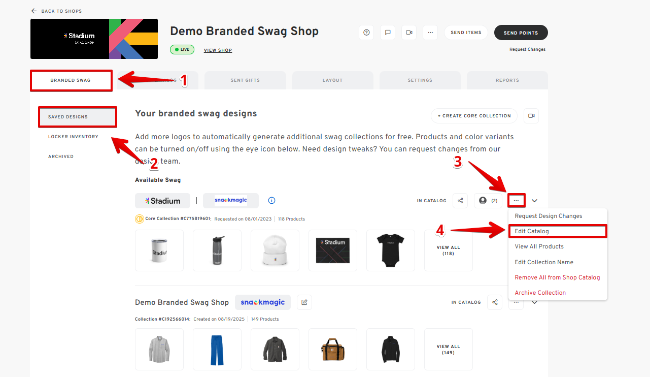 - Click the three dots on the swag collection you wish to edit, then click the "EDIT CATALOG" button.