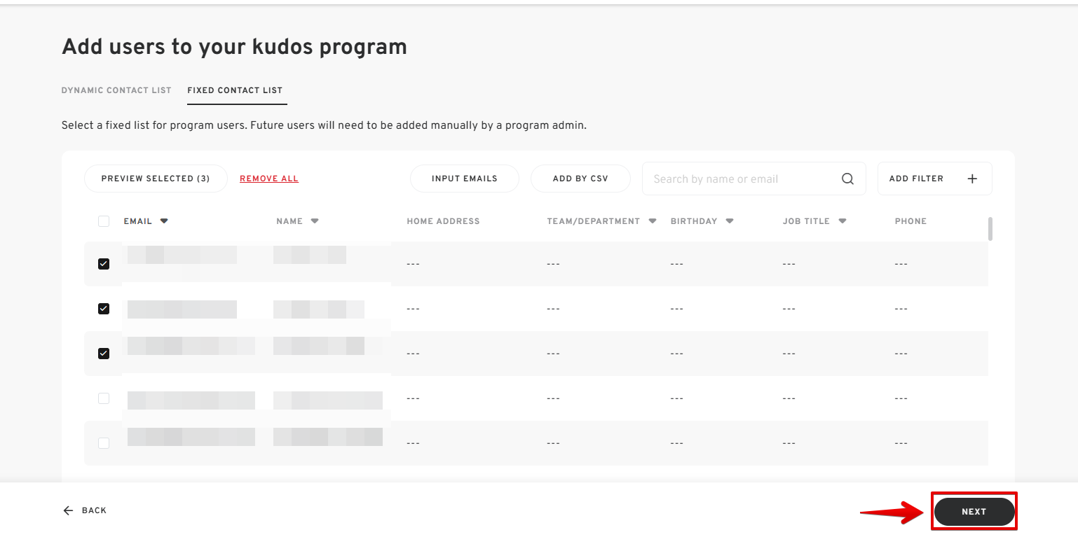 - Once you have added people to your contact list, click "NEXT" once you have selected your recipients.