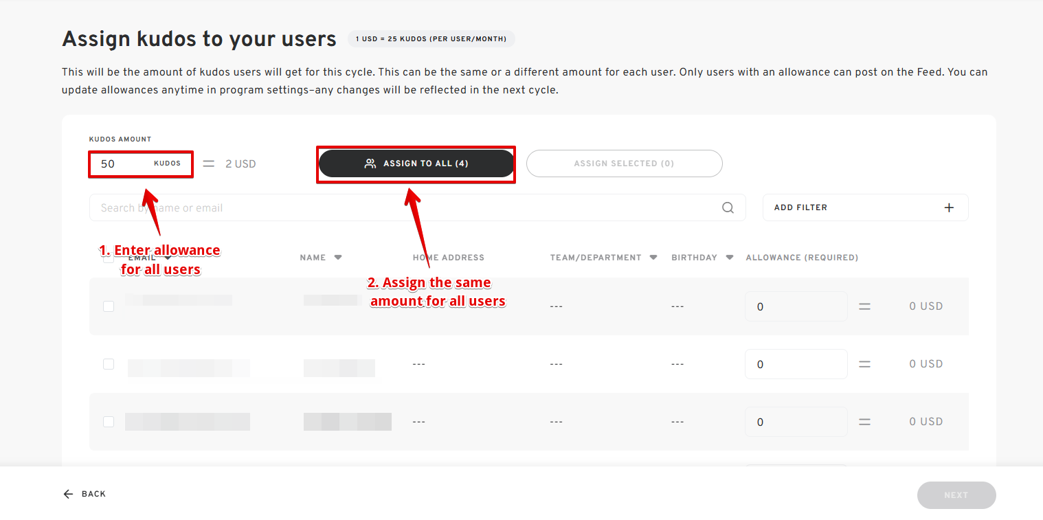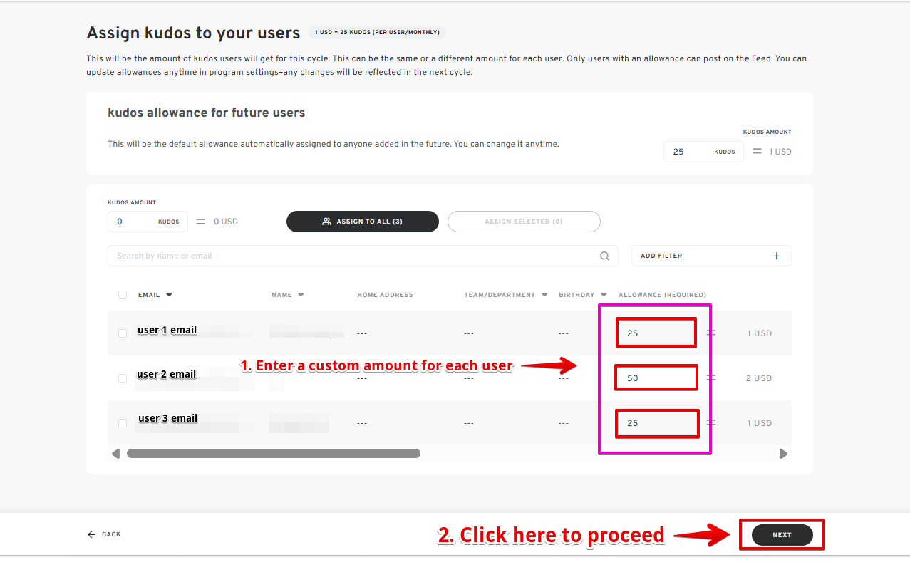 - Under the current user list, enter the desired kudos allowance.