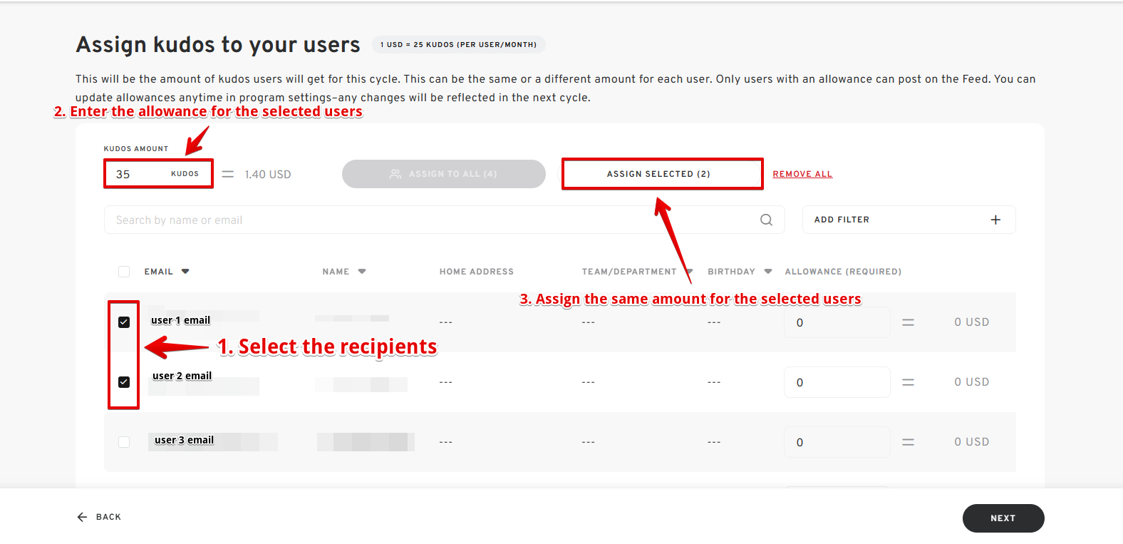 - Enter the desired kudos allowance for the selected recipients.