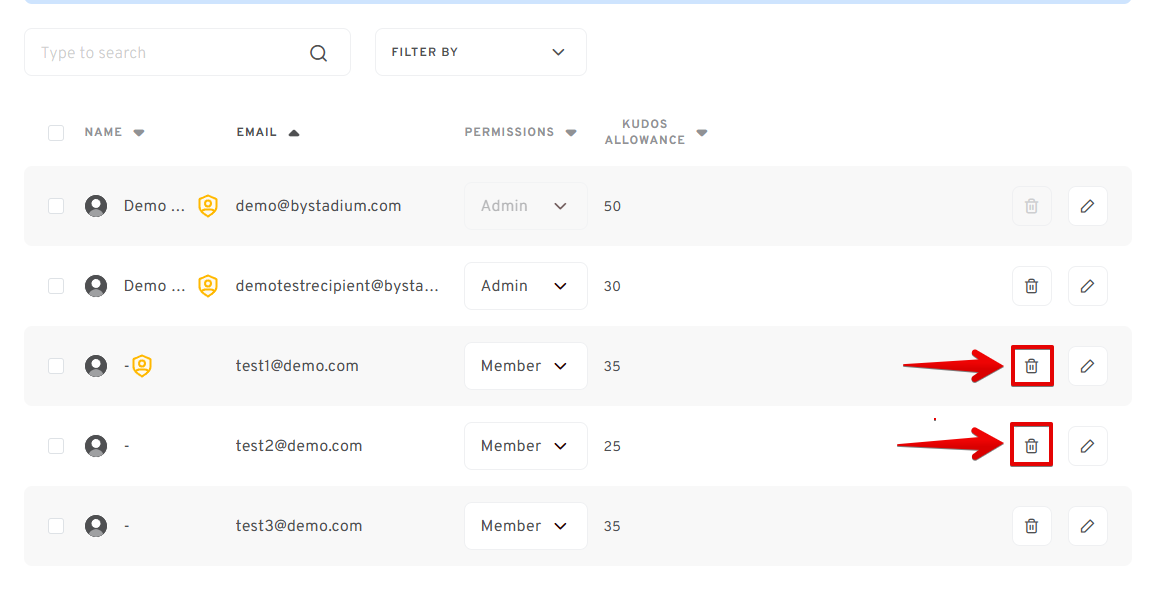 - Locate the user you want to remove, then click on the trash icon next to their email address.