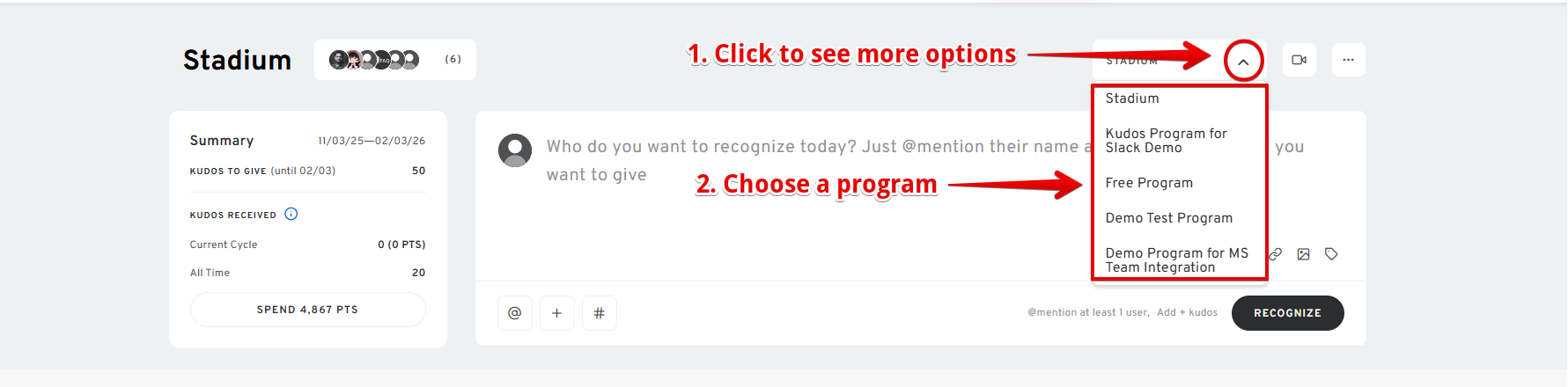- If you have multiple kudos programs, just click on the drop-down arrow on the upper right and select the program that you wish to check.