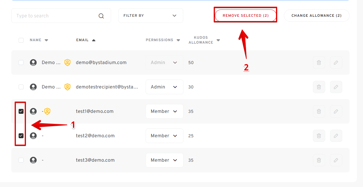 - Click the checkbox next to the email addresses of the users you want to remove.