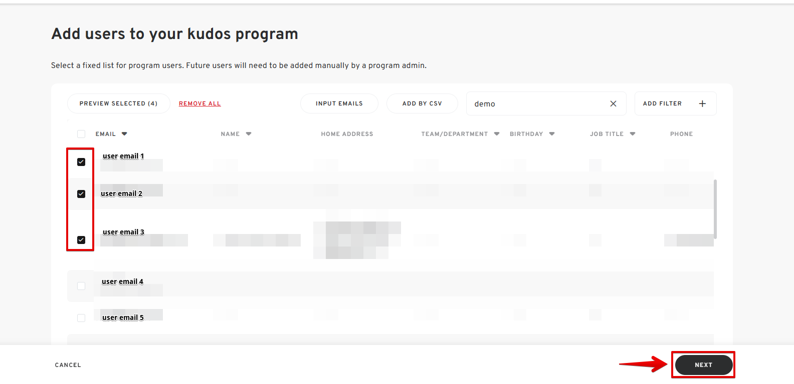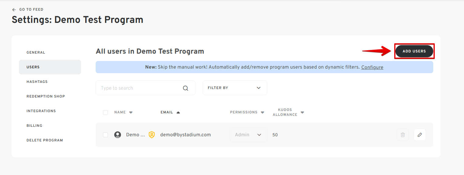 - Click the ADD USERS button to add new recipients to your Kudos program.