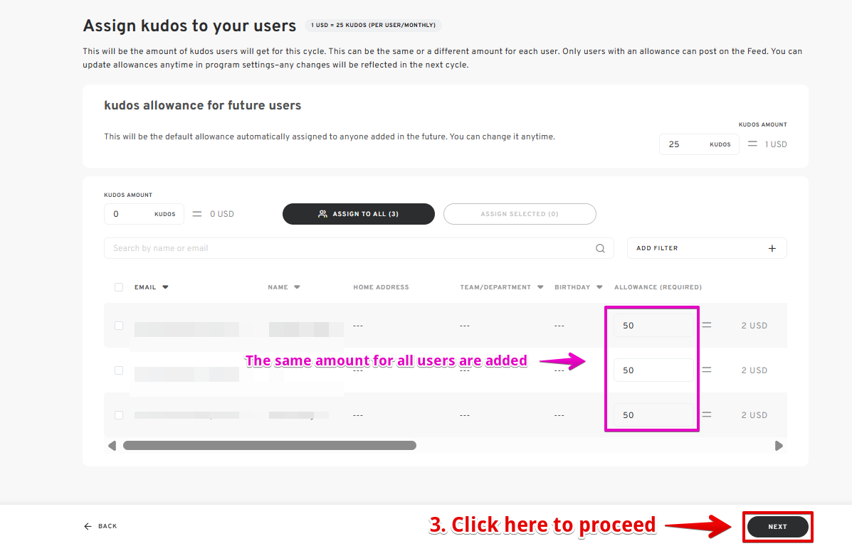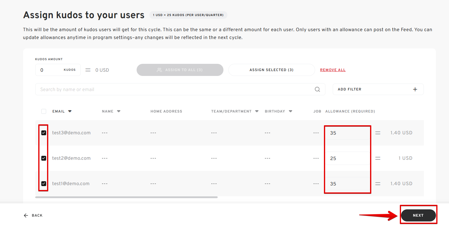 - Enter the desired kudos allowance for the selected recipients.