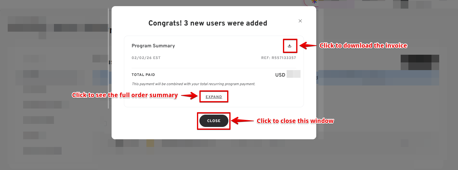 - Once done, you will see a confirmation window, where you have the ability to download the invoice and see the full order summary.
