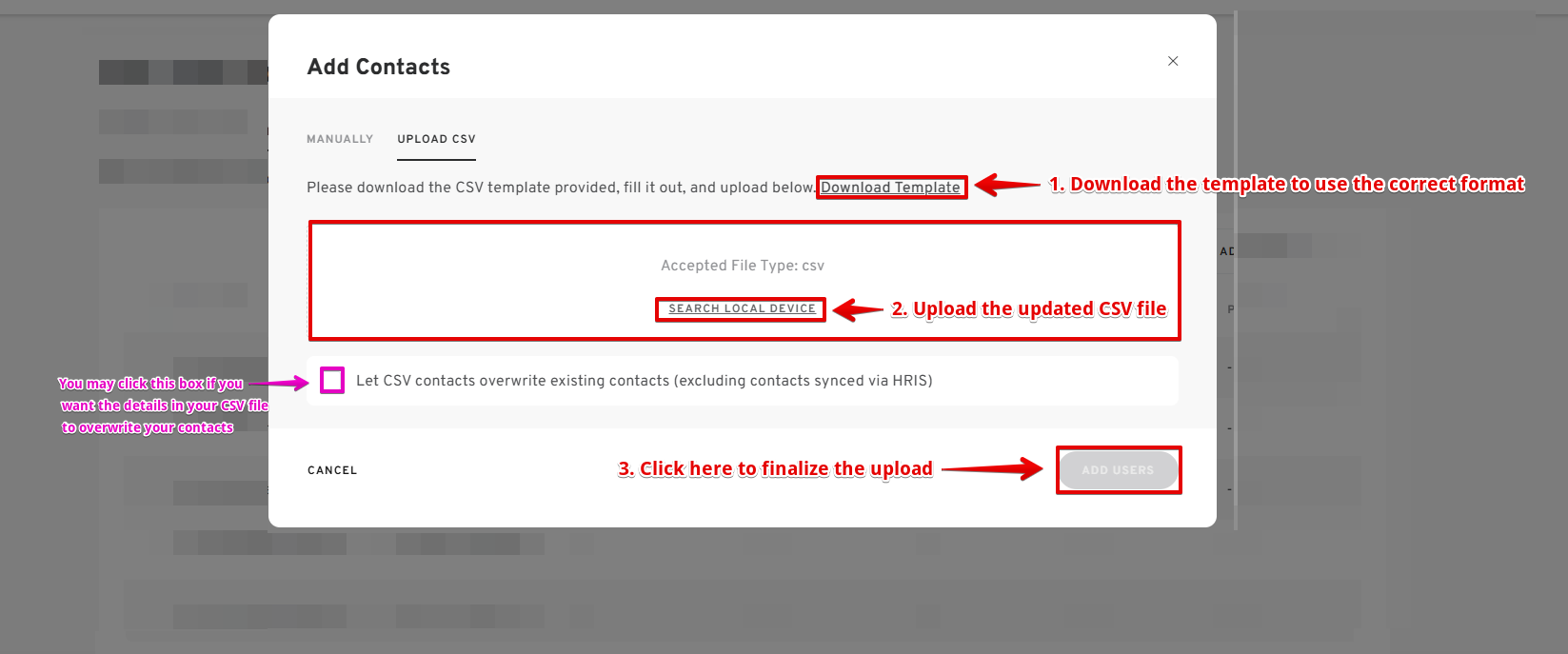 - Optional: If you want the information from your CSV sheet to overwrite your existing contact list, click on the check box.