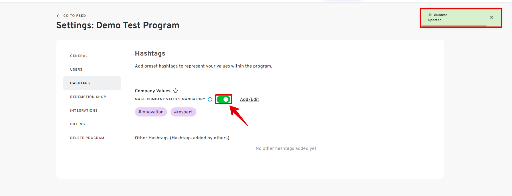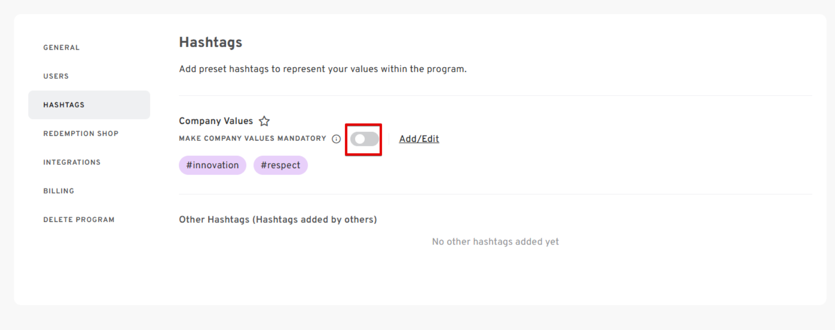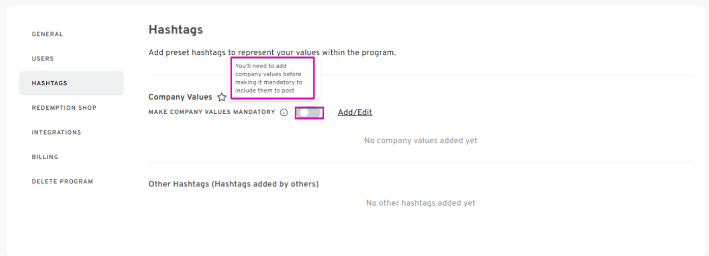 - If you want the hashtags to be REQUIRED on each post, click on the toggle button beside MAKE COMPANY VALUES MANDATORY.