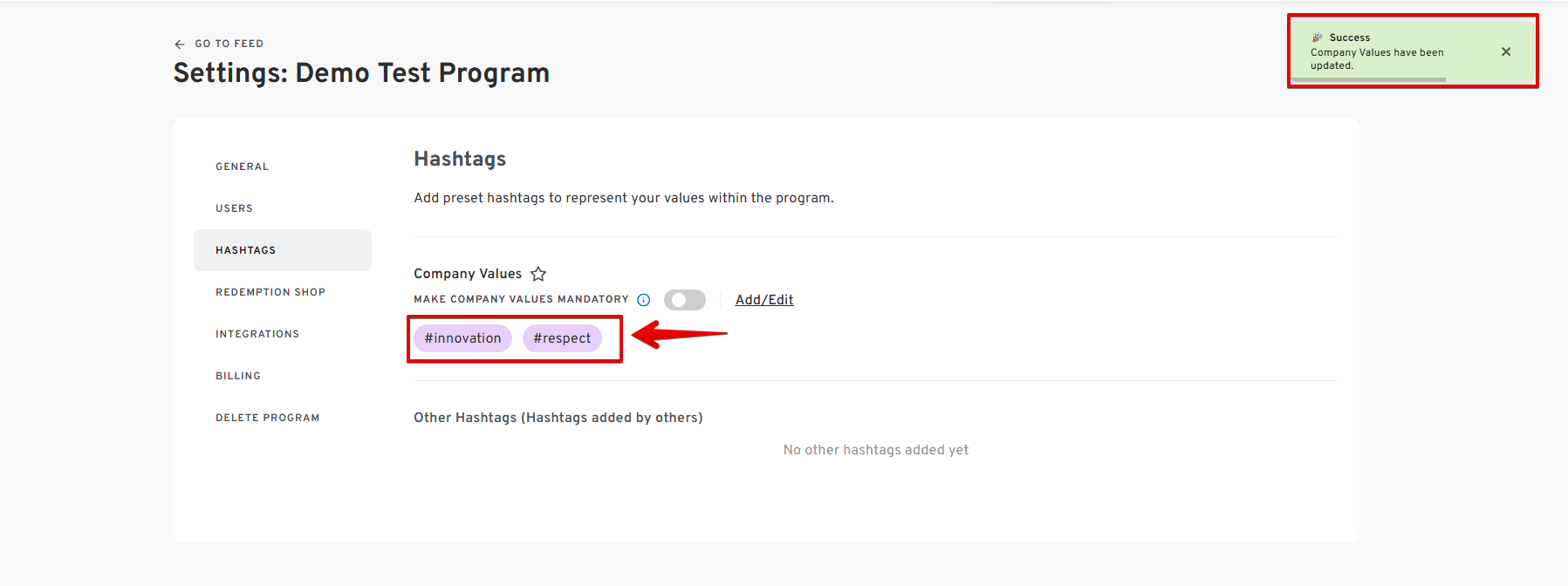 - You will receive a confirmation message indicating that the company values have been successfully added to the list of hashtags.