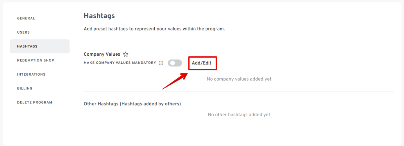 - Within the Hashtags section, click on 'Edit' to add your company values hashtags.