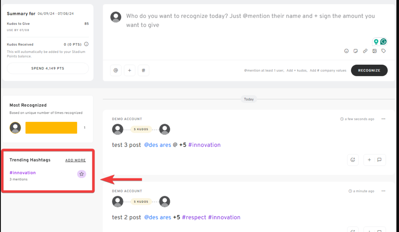 Kudos programs often thrive on emphasizing core company values. Incorporating company value hashtags ensures that each recognition post aligns with these values, reinforcing organizational culture and priorities. Here's how you can add and manage company value hashtags to your Kudos Program.