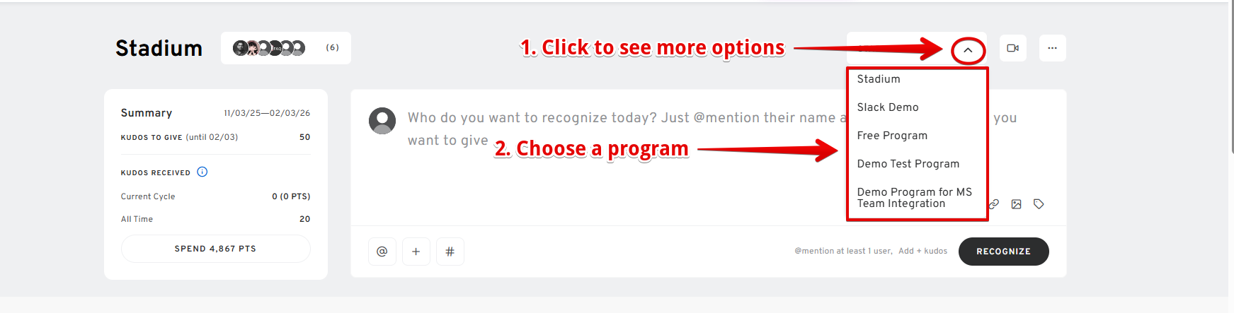 - If you have multiple kudos programs, just click on the drop-down arrow on the upper right and select the program that you wish to check.