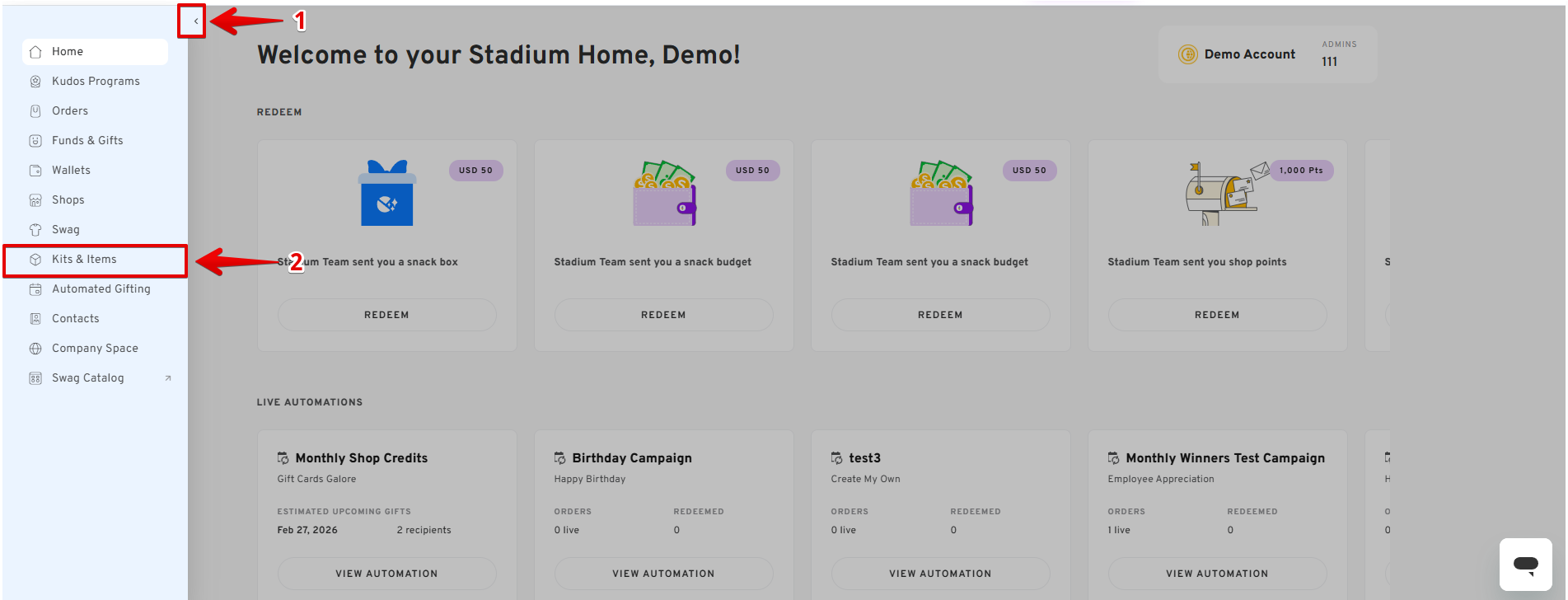 - In the sidebar menu, locate and click on "Kits & Items" to access your kits and send items page.