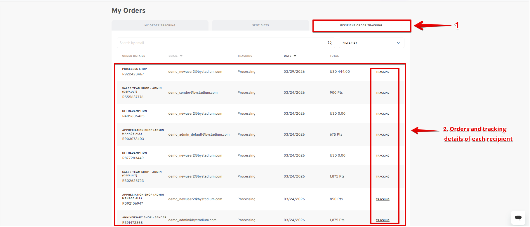 - If you want to check a specific order and its tracking details, click on TRACKING to see specific tracking details for your recipient's order.