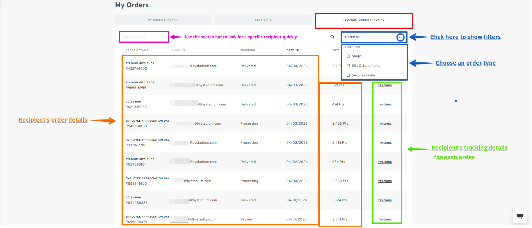 Efficiently manage and track your recipient orders with our comprehensive guide. Designed to enhance your experience, this guide ensures you can quickly access delivery statuses, track individual items, and manage orders from various sources, including shops, kits, and automated orders. Stay informed and in control with Stadium’s streamlined order tracking features.