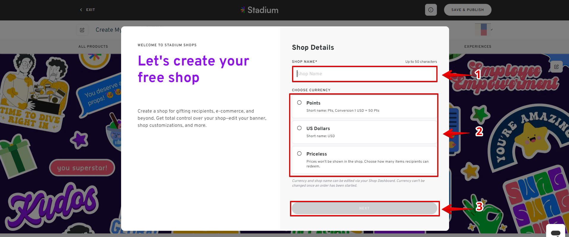 - A pop-up page will appear asking for the Shop Name and Currency (Points or USD). Fill in the details and click "NEXT".