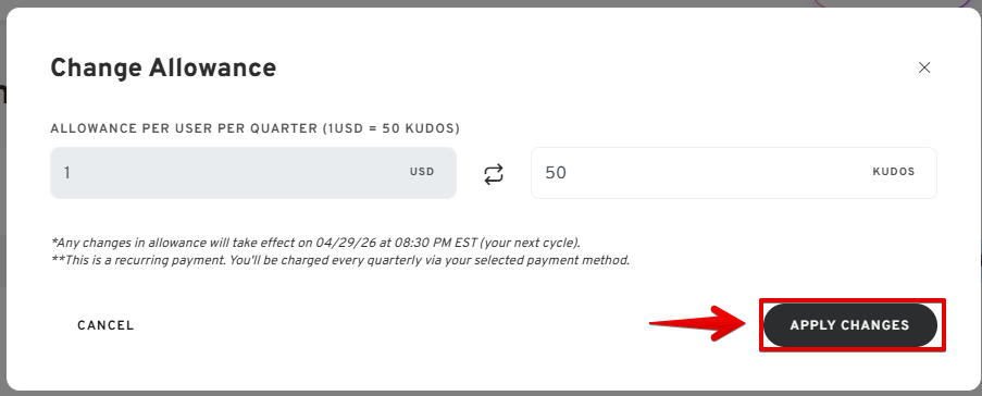 **This is a recurring payment. You'll be charged every month via your selected payment method.- Once you set the budget, click "APPLY CHANGES".