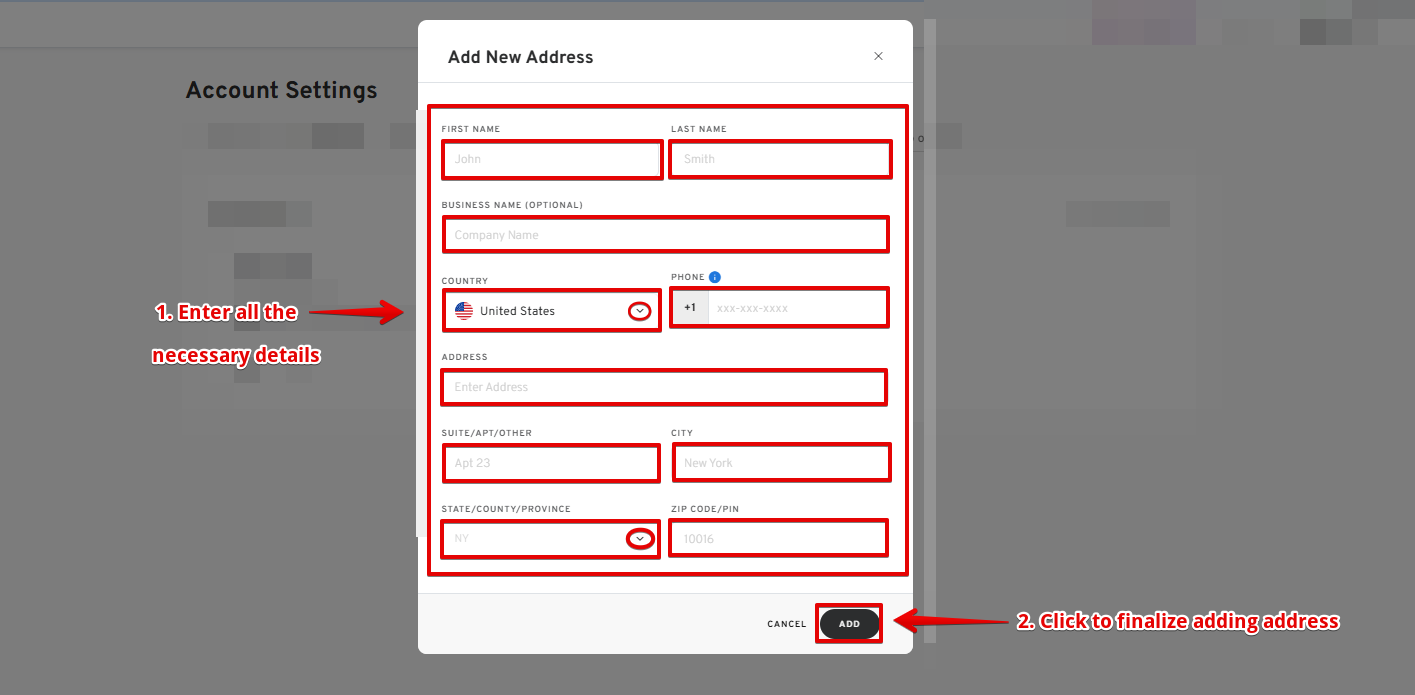 - Enter your new address details and click the ADD button.