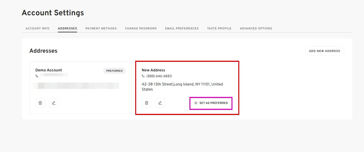 - If this new address is permanent, you may choose to set it as the default address for future orders by clicking the SET AS PREFERRED button.