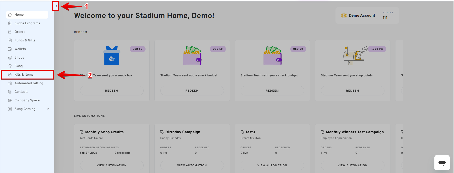 - In the sidebar menu, locate and click on "Kits & Items" to access your kits and send items page.