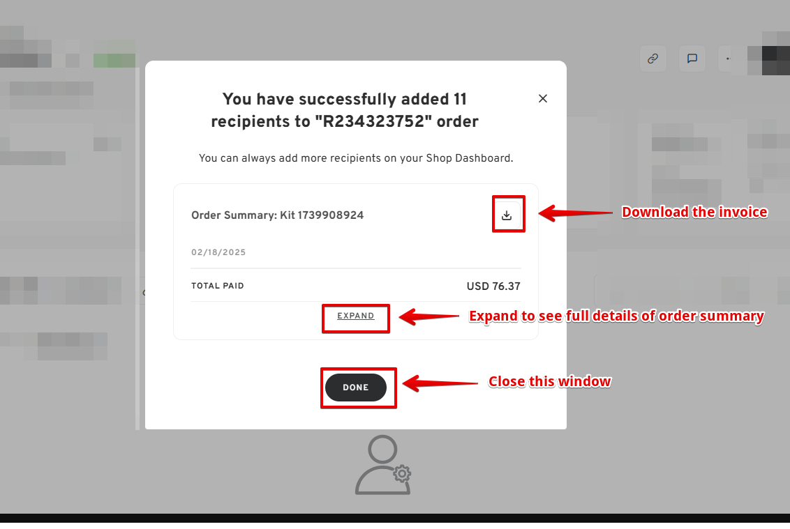 - A confirmation message will appear indicating that the recipient's email has been successfully added. On this page, you will also have the option to download your order invoice and view the payment breakdown.
