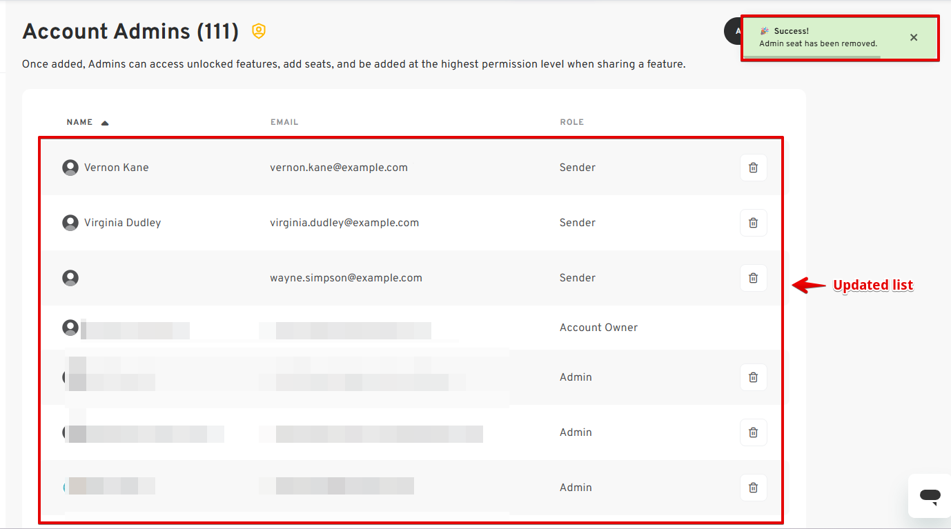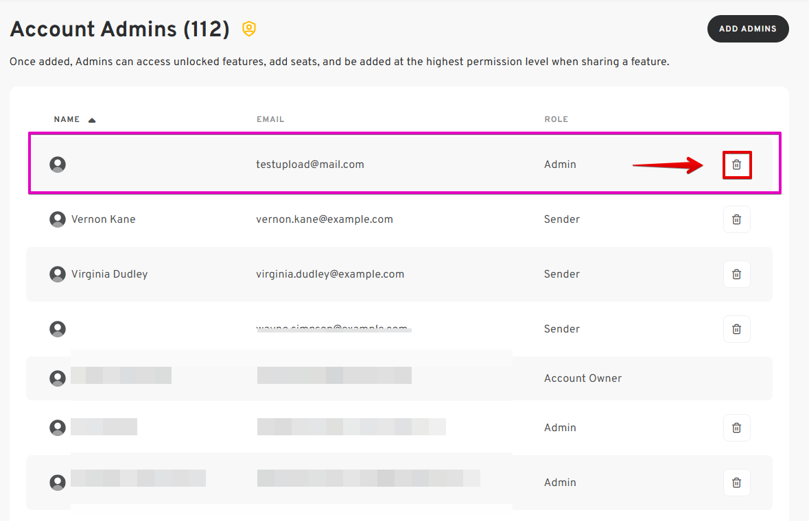 - If the admin is linked to live automated gifts or other assets, an error message will appear.