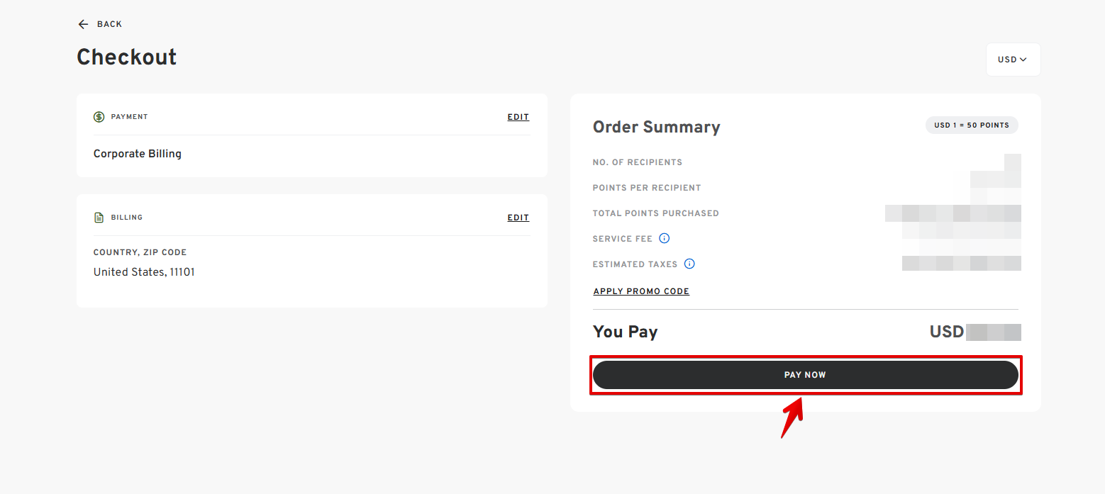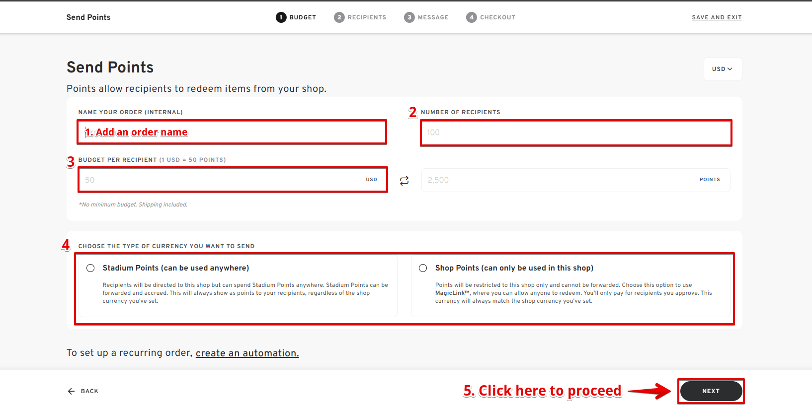 - Enter your preferred order name and specify the number of recipients you have, as well as the budget per recipient. It's important to note that the budget won't be visible to your recipients and will automatically convert to points if you opt for this method. Shop credits will be displayed in your currency, but you still have the option to choose your preferred currency from the drop-down menu.