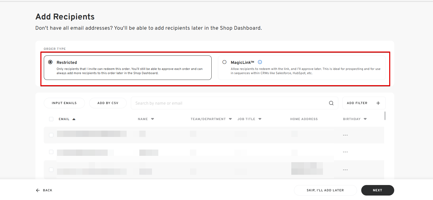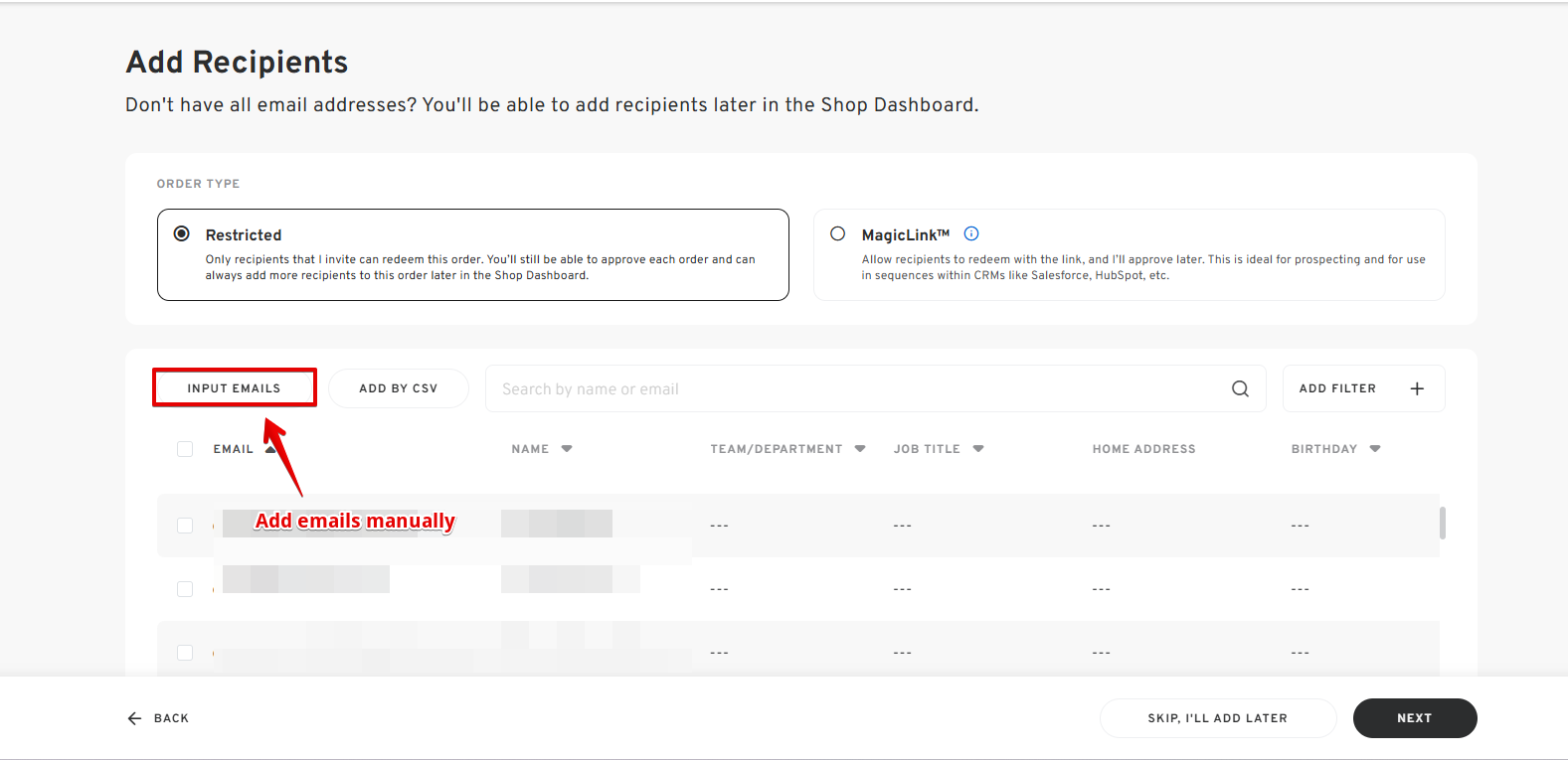 - If you already have some recipient email addresses, you can add them during the order setup.