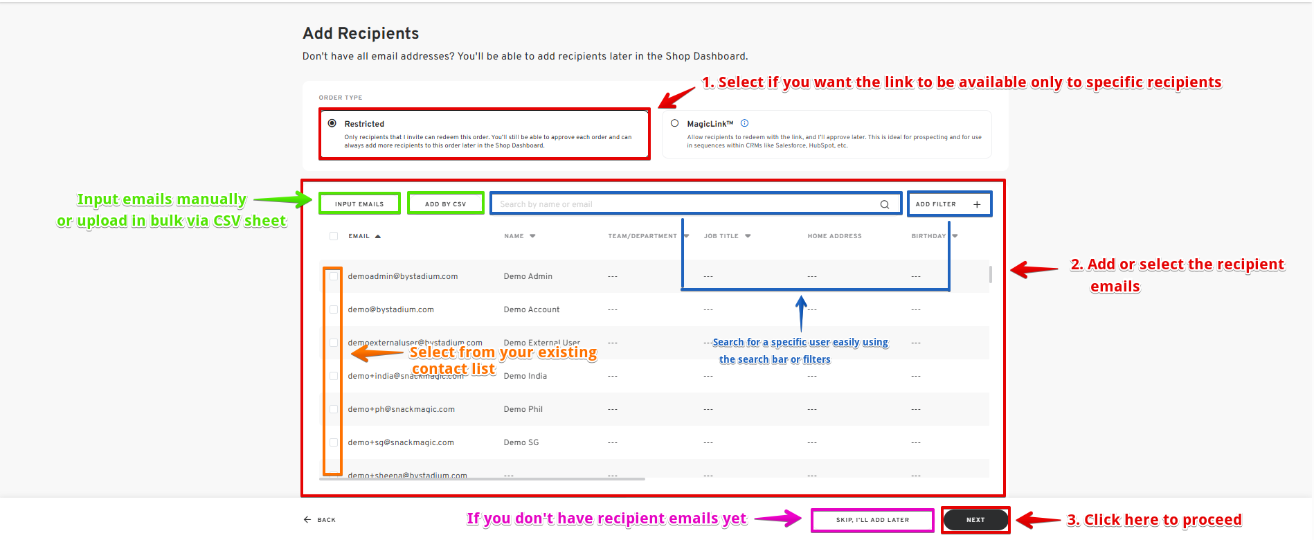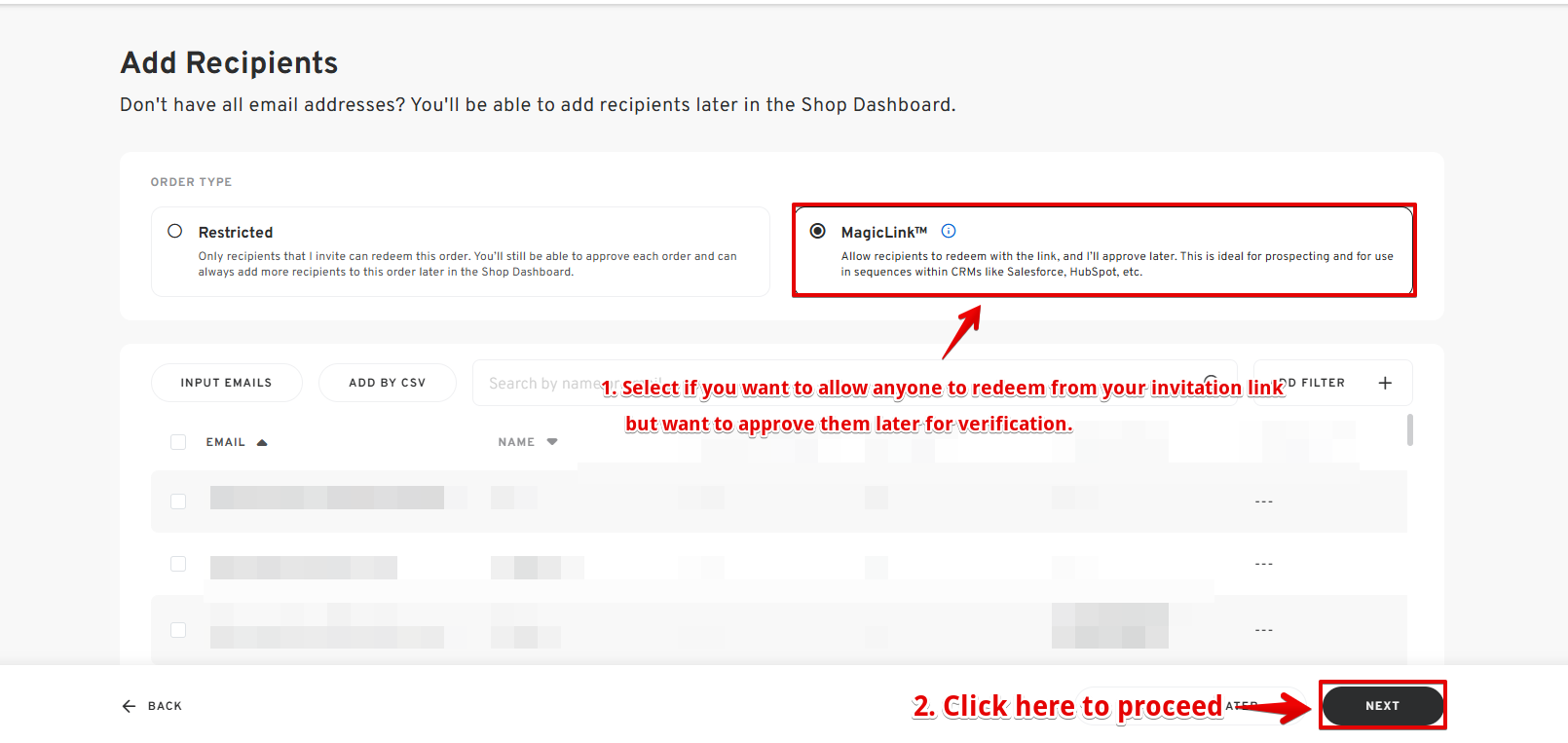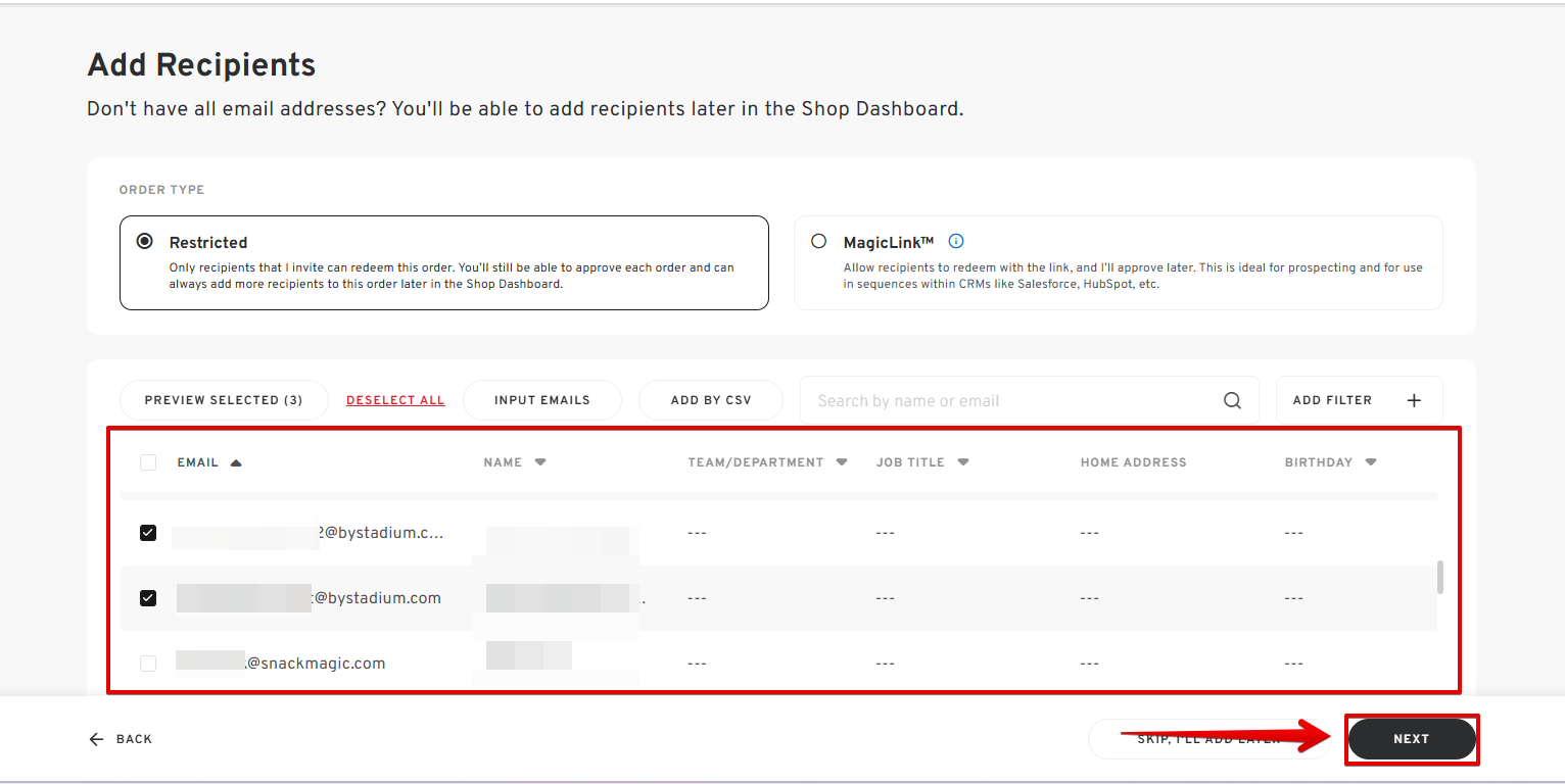 - Once the recipient emails are added or selected, click NEXT to proceed.