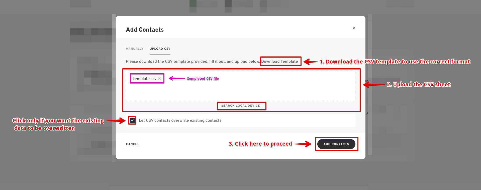 - Once you are done filling out the CSV file, you can upload and click on ADD CONTACTS