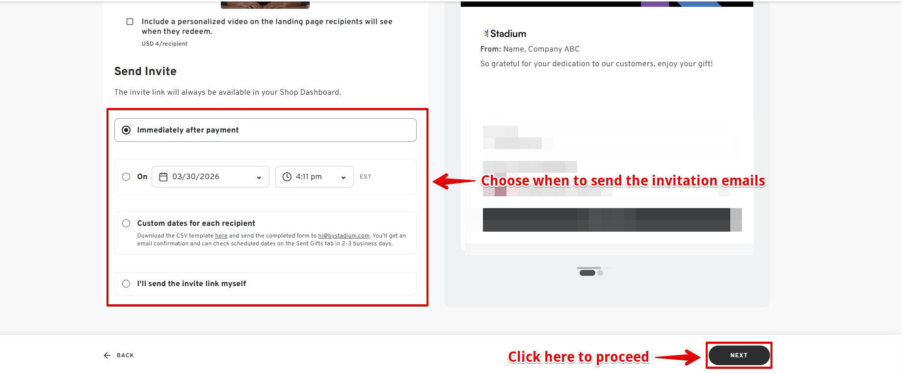 - Custom date for each recipient (ideal for birthdays) - For this option, make sure to download the CSV file, fill it out, and send it to hi@bystadium.com
