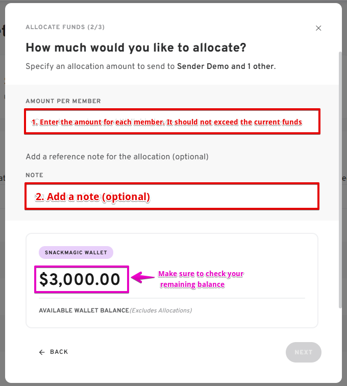 Allocating funds to multiple users is ideal when you want to distribute the same amount of funds to several members simultaneously.