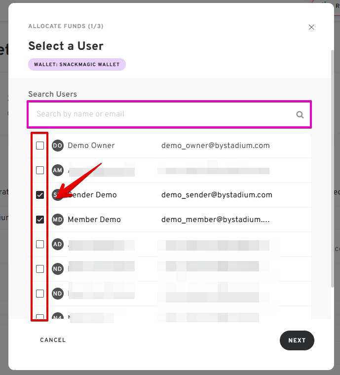 Use the search bar or filters to find the specific user you want to allocate funds to.