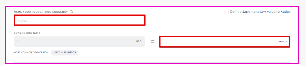 - Select a distinctive name for your recognition currency and determine its conversion rate. By default, it will be referred to as "Kudos."