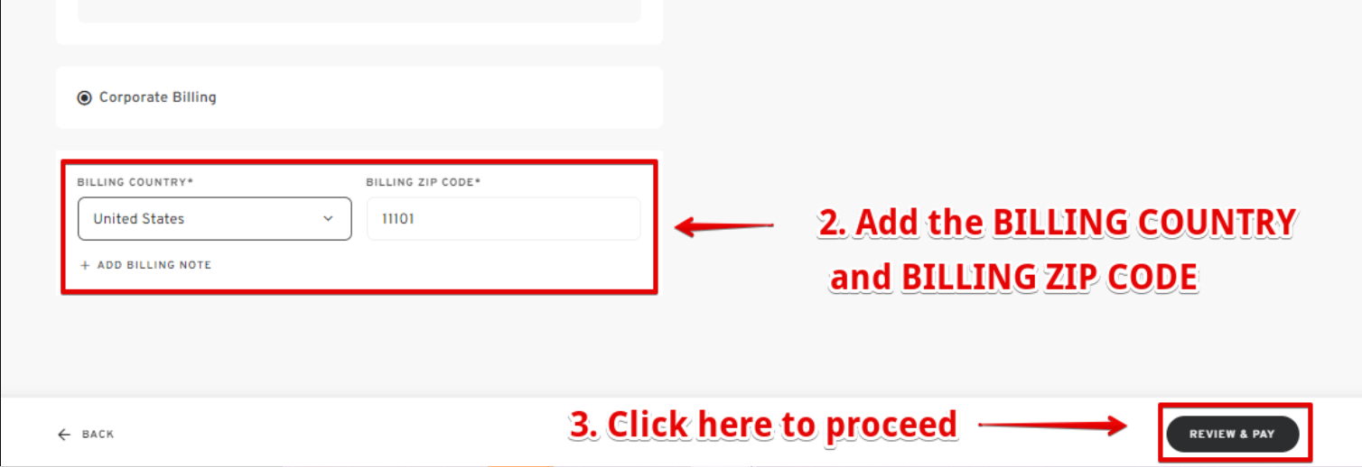 - Enter your billing country and billing ZIP code, then click "REVIEW & PAY."