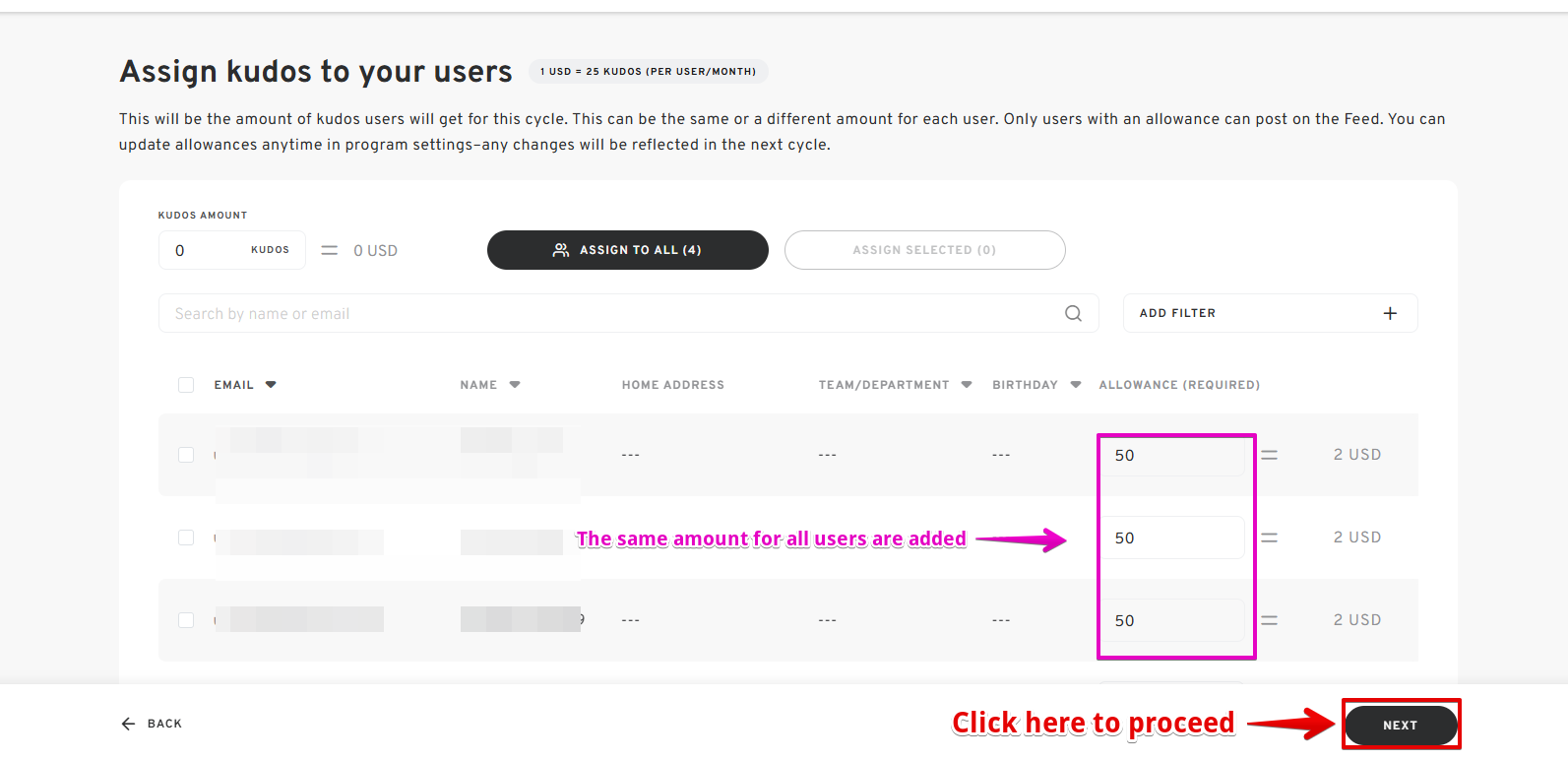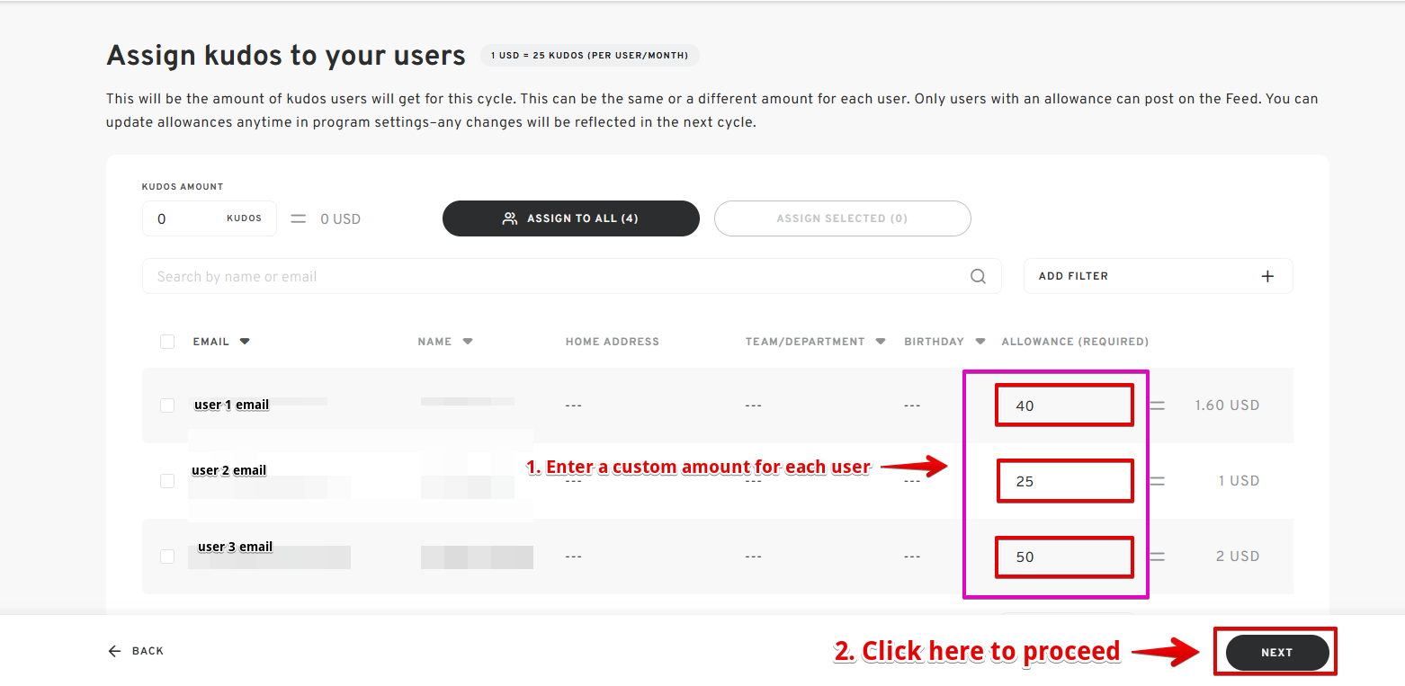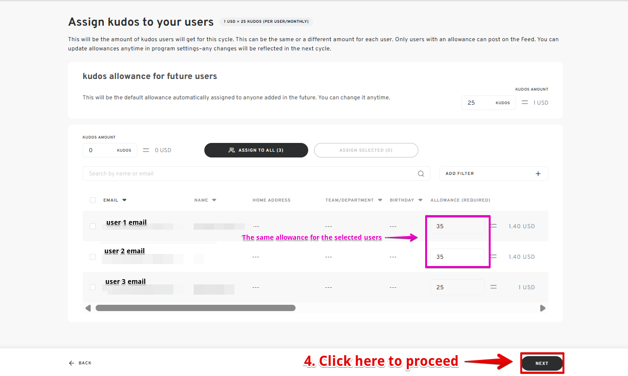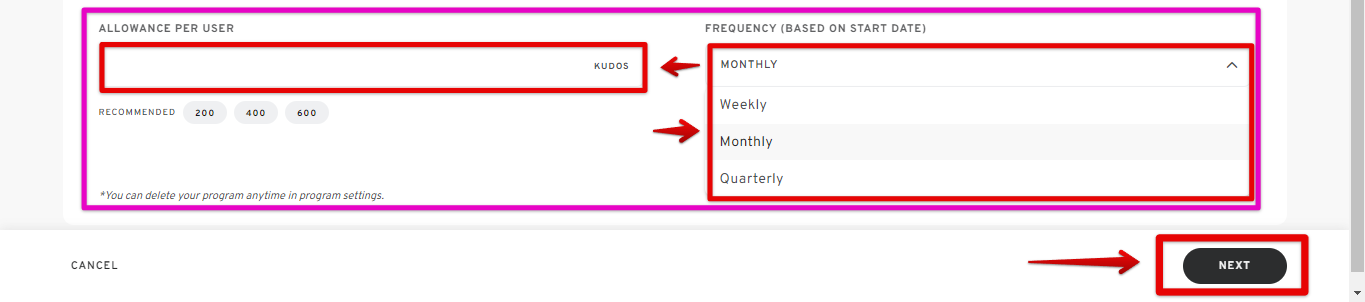 - Define the allowance for each user and specify how frequently they receive it. This ensures a fair and consistent distribution of recognition currency throughout your organization. Click "NEXT" once done.