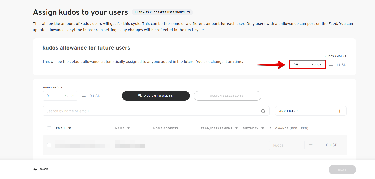 - Under the current user list, enter the desired kudos allowance.