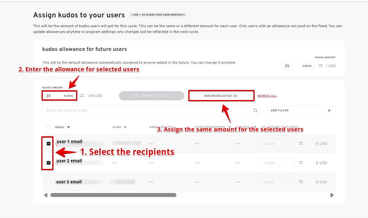 - Enter the desired kudos allowance for the selected recipients.