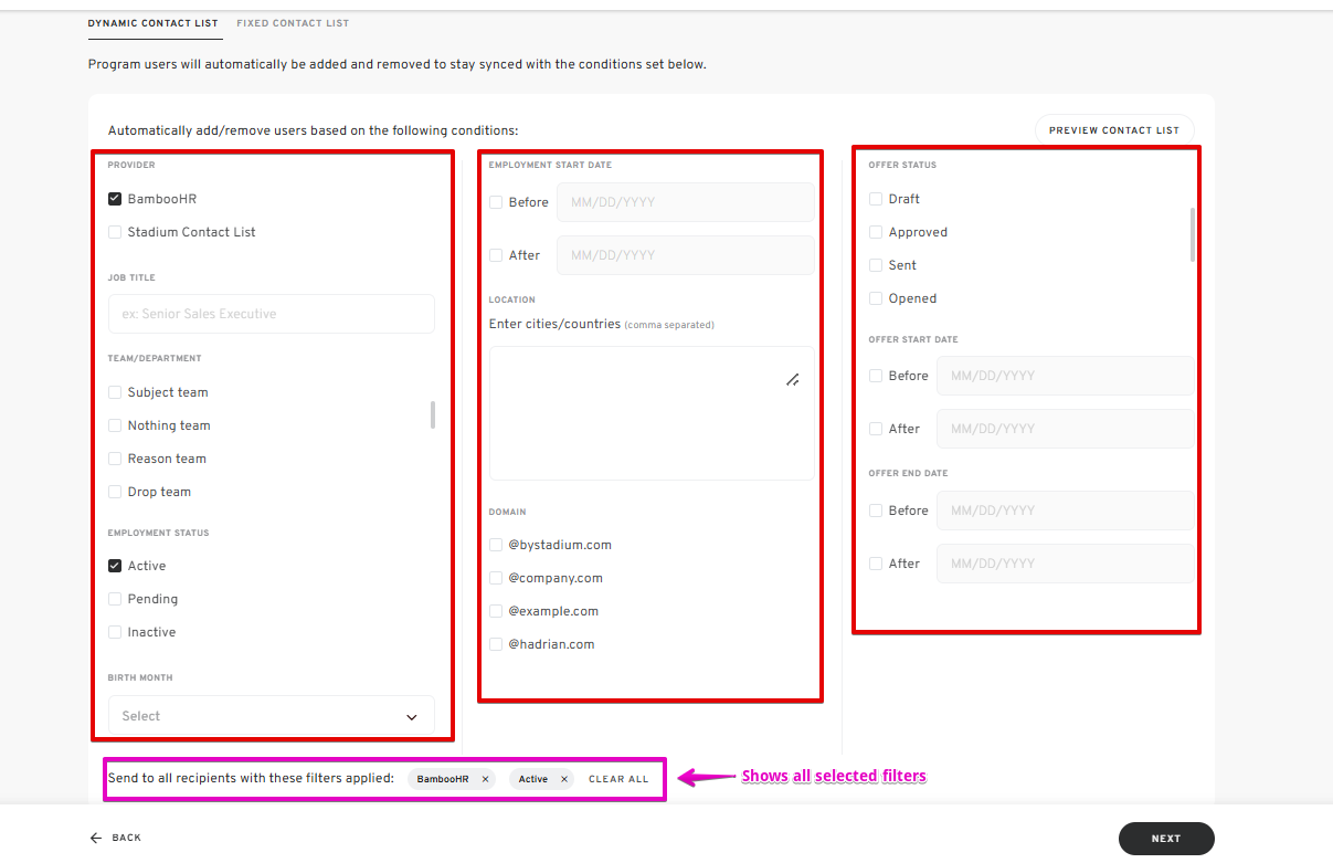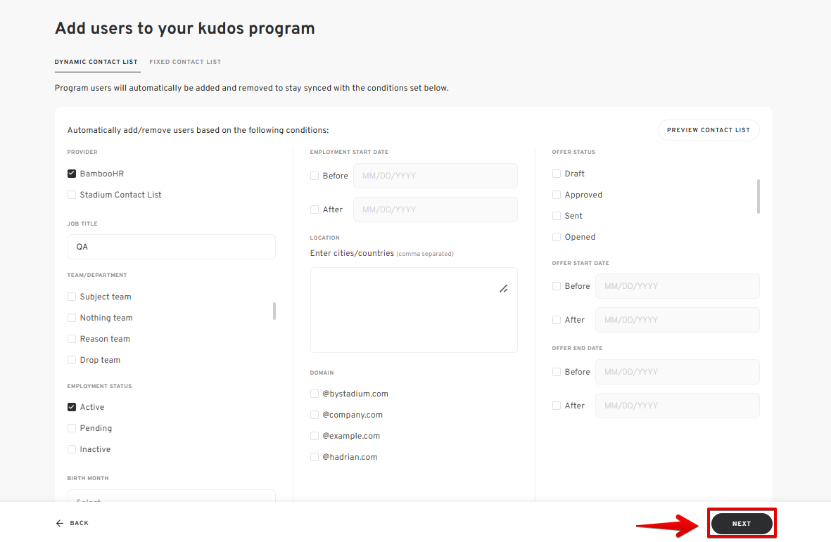 - Click "NEXT" to proceed to the next steps once your Dynamic Contact List is set up.