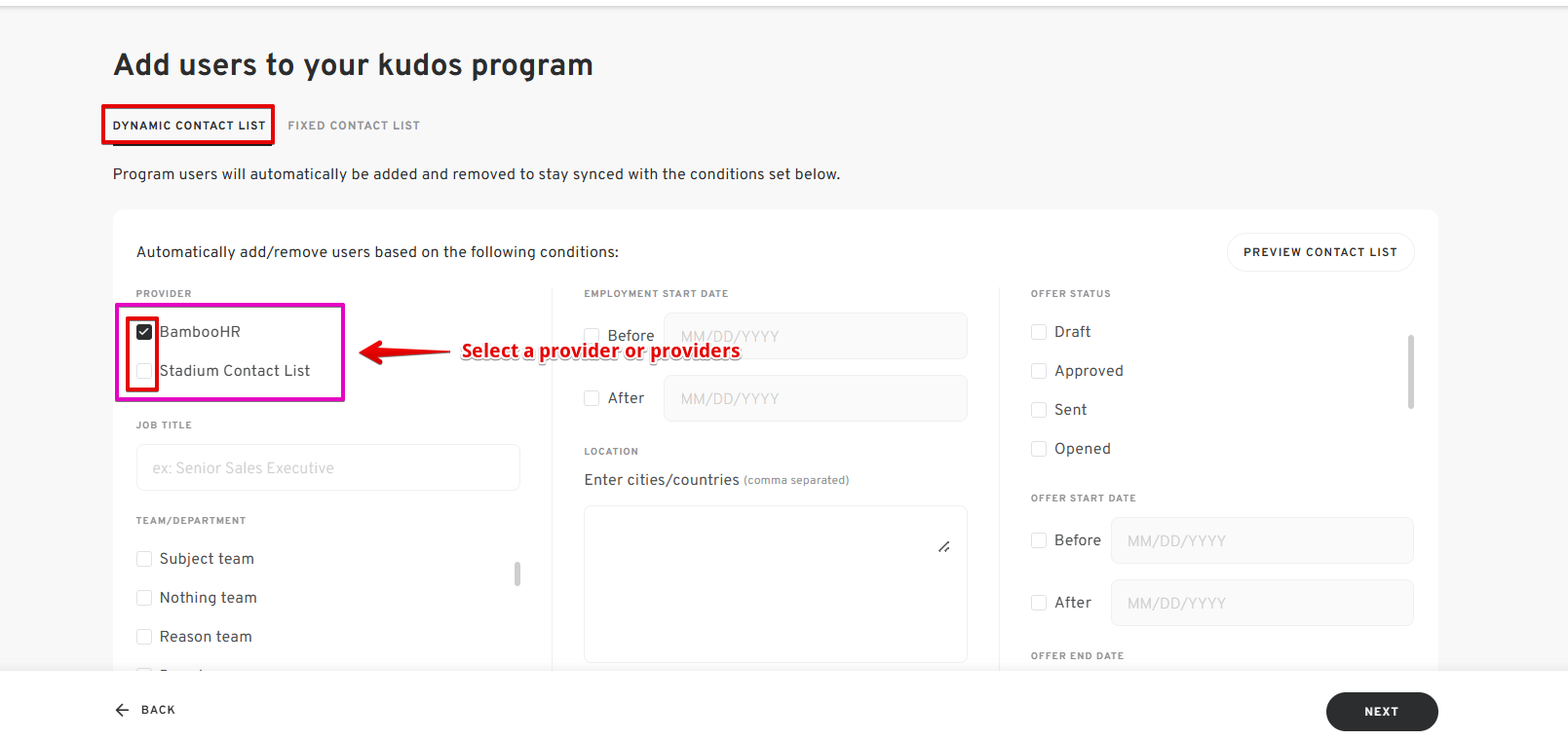 - Select the Provider(s) or the HRIS you want to use for this program.
