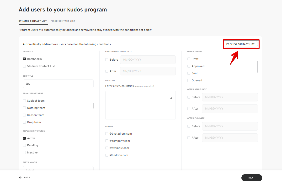 - Once the filters are set, click on PREVIEW CONTACT LIST