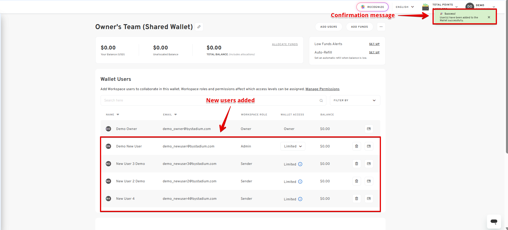 - A confirmation message will appear at the top right, and the user will now be listed under the Wallet Users section.