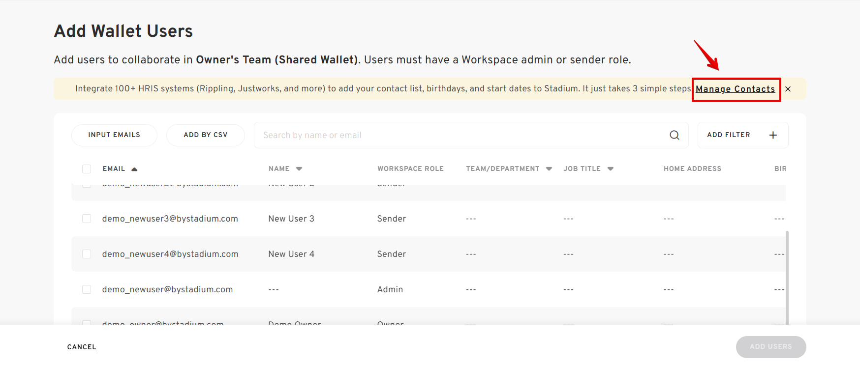 - If your Workspace supports integration, click “Manage Contacts” to sync users automatically by integrating your HRIS platform.