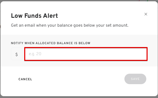 Example: Enter 20 USD to receive an alert when the allocated balance is low.