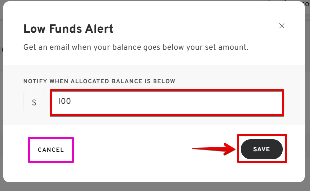 An email notification will be sent when the balance falls below the entered amount.