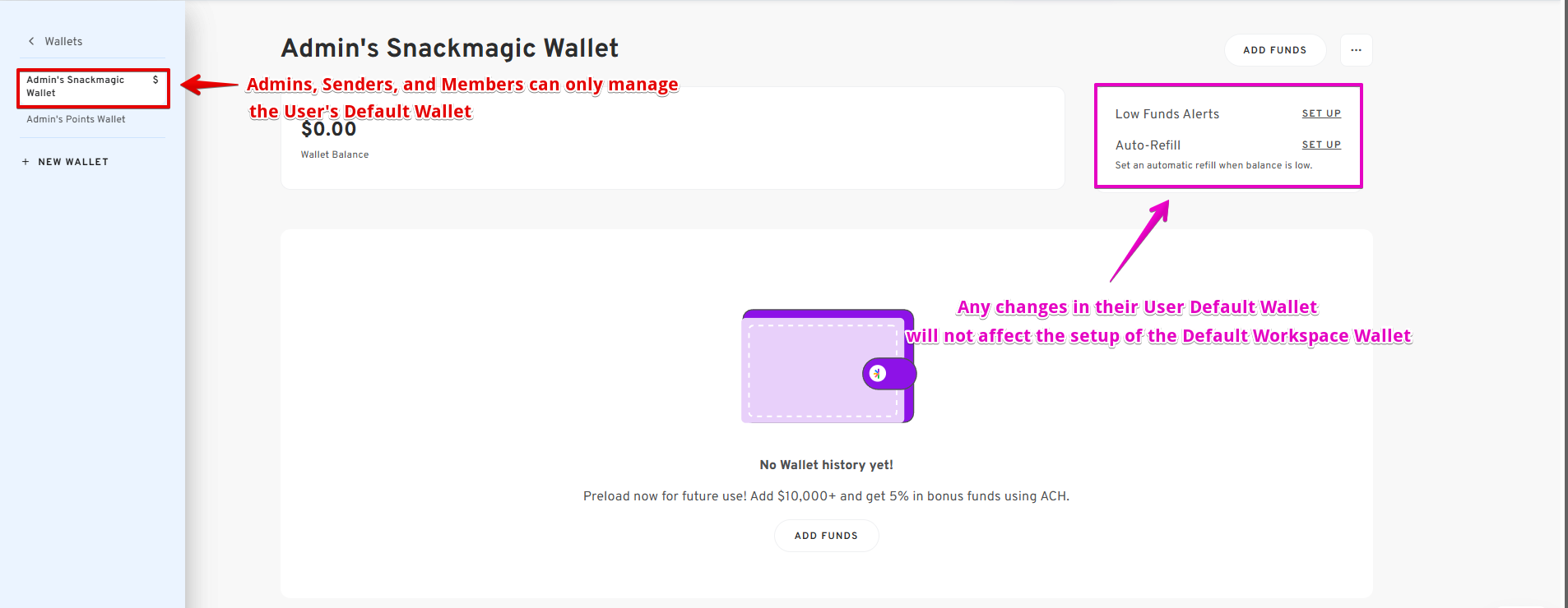 If an owner enables Low Funds Notification in their User Default Wallet, Low Funds Notification is automatically enabled for the Default Workspace Wallet.