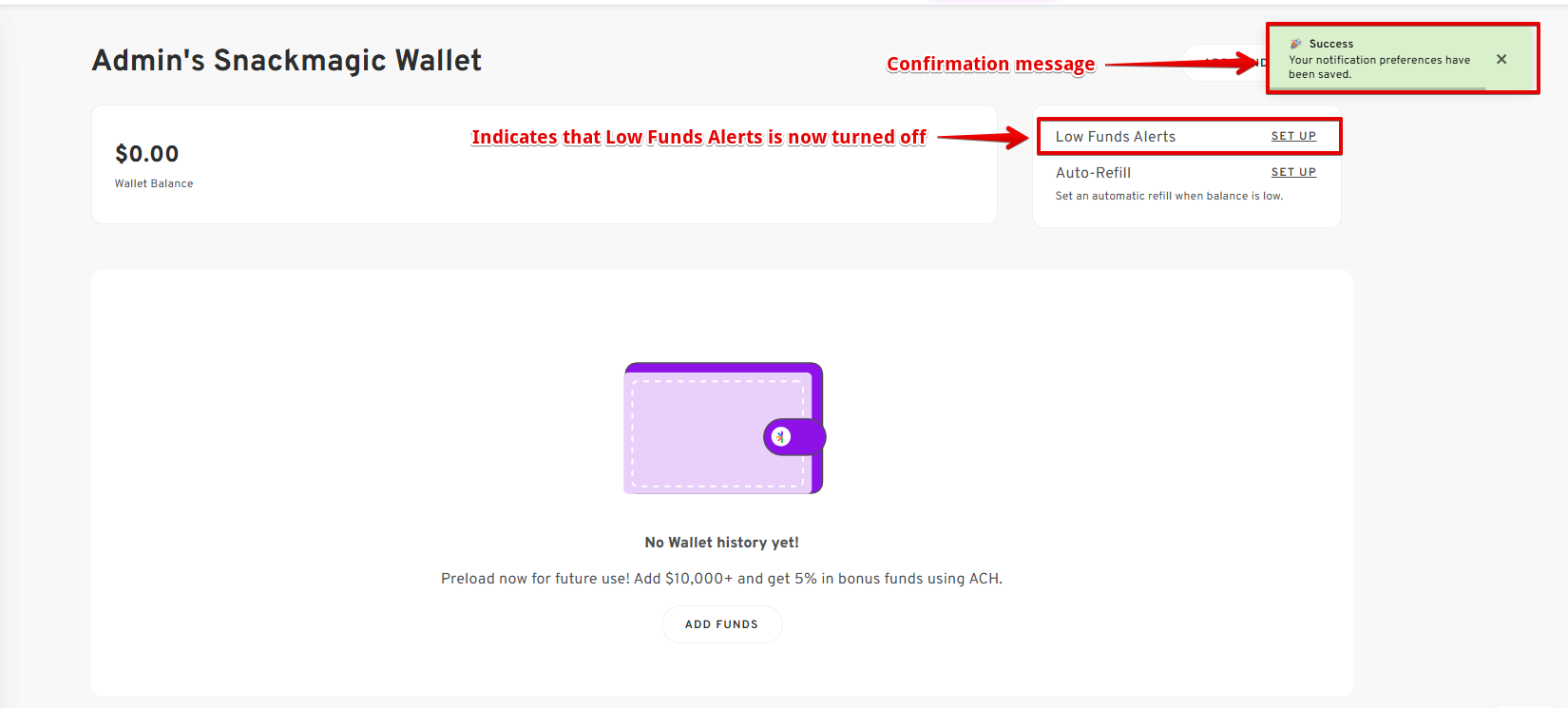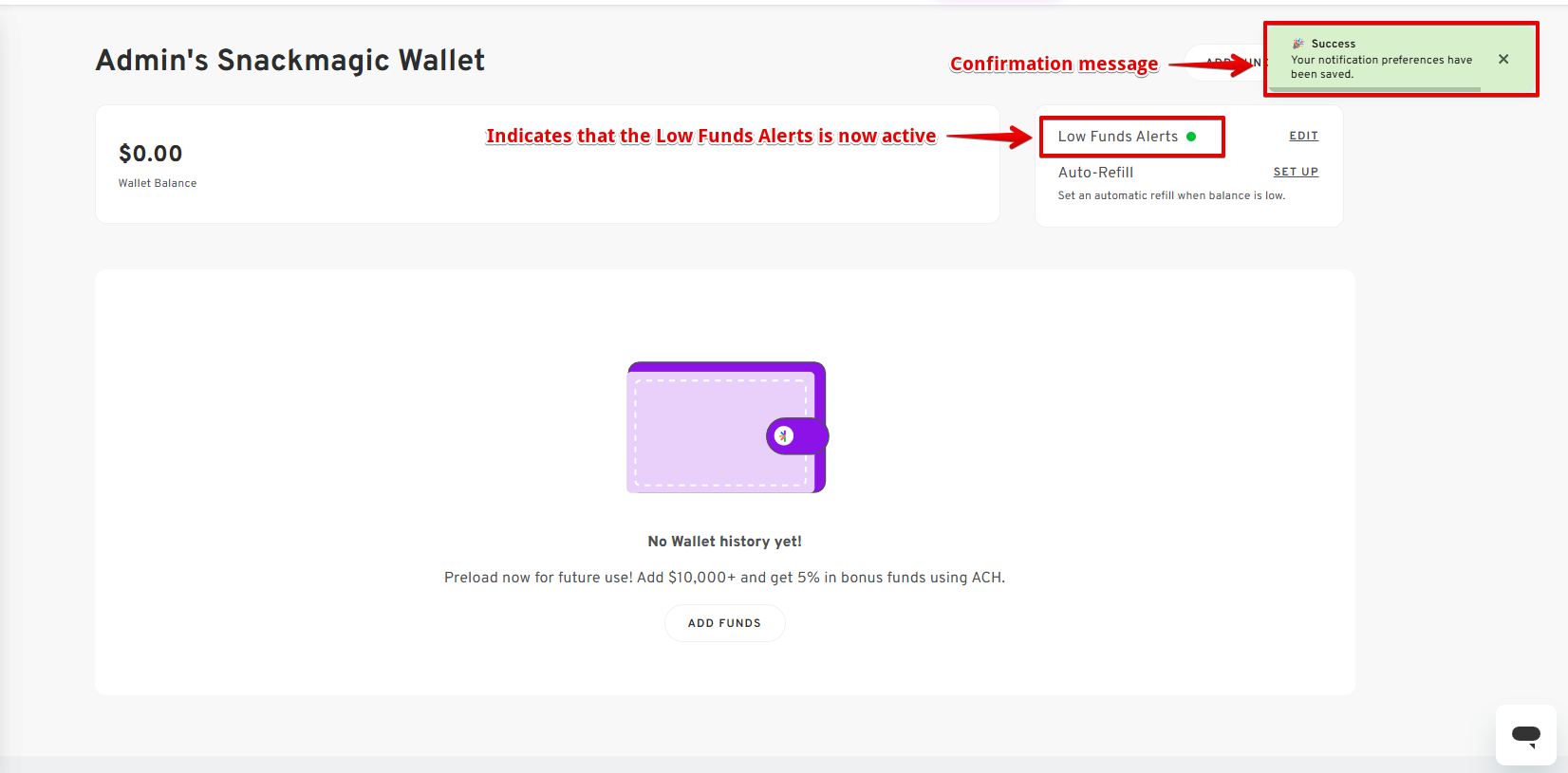 - Activating Low Funds Notification from the User's Default Wallet Page